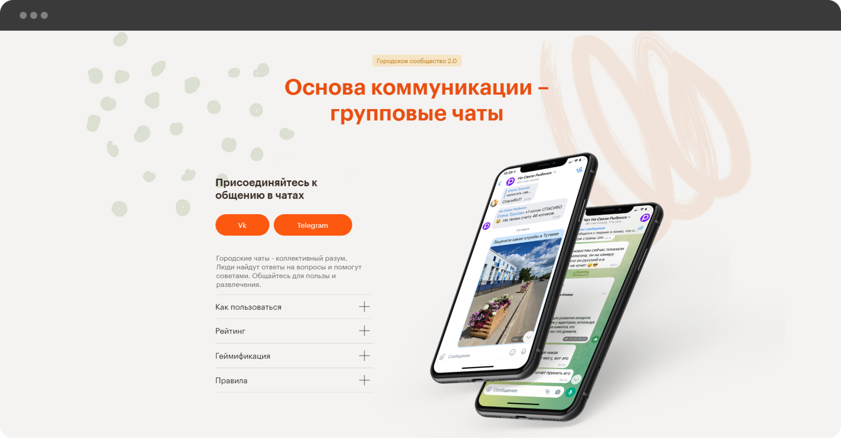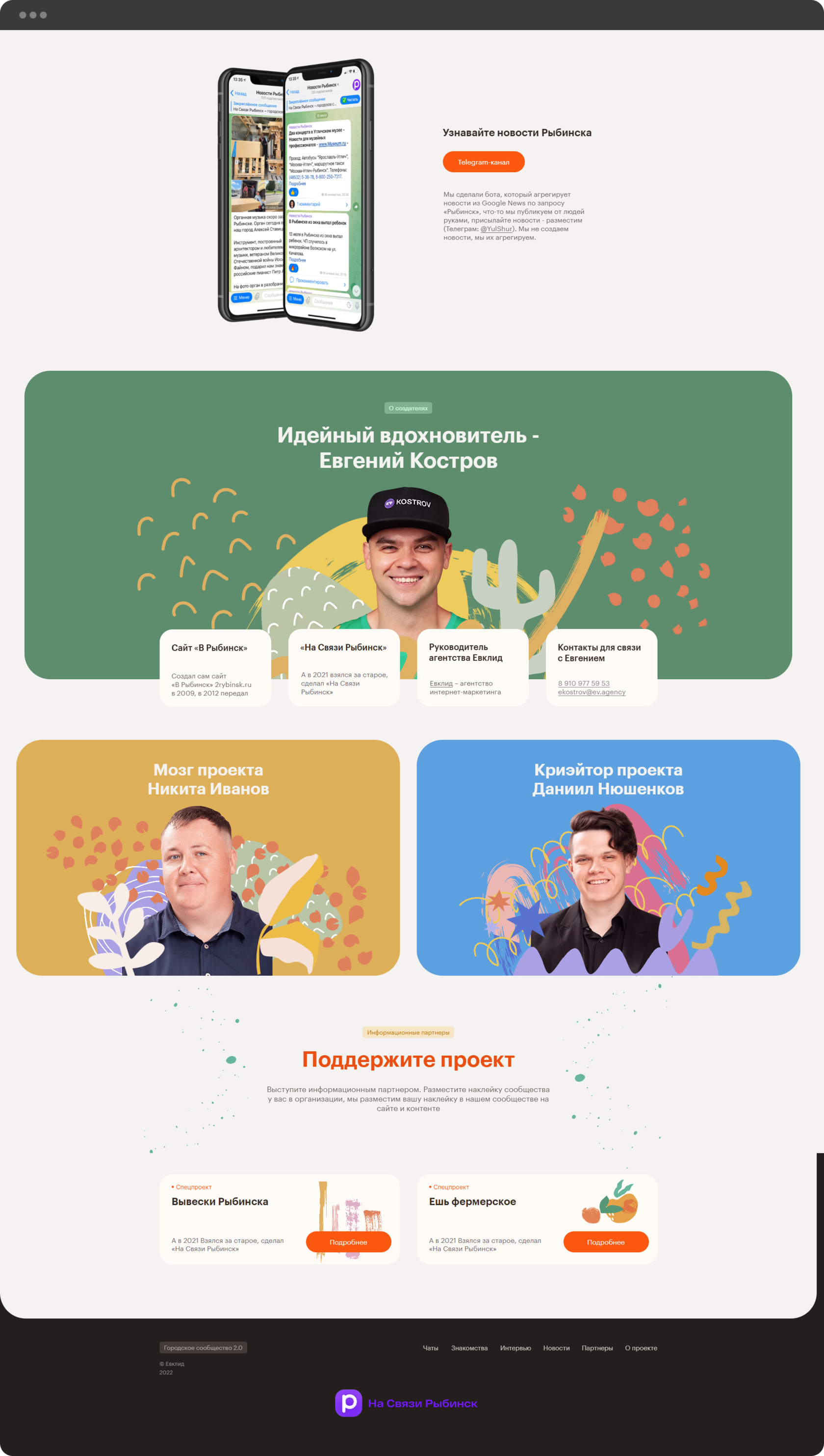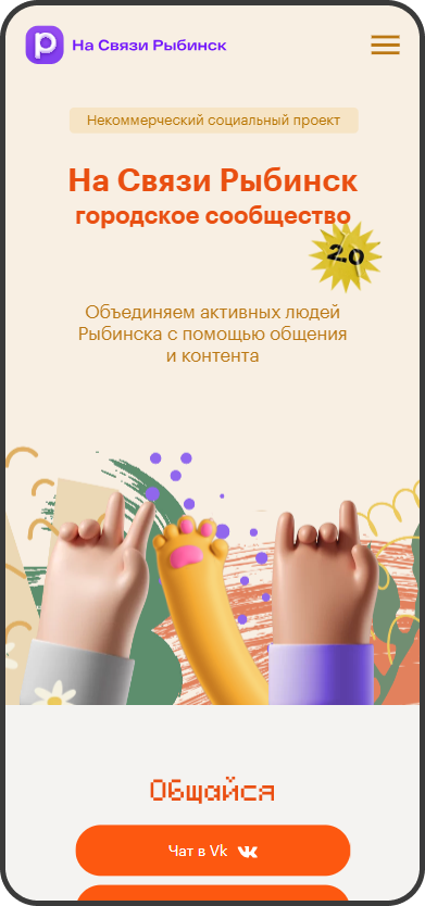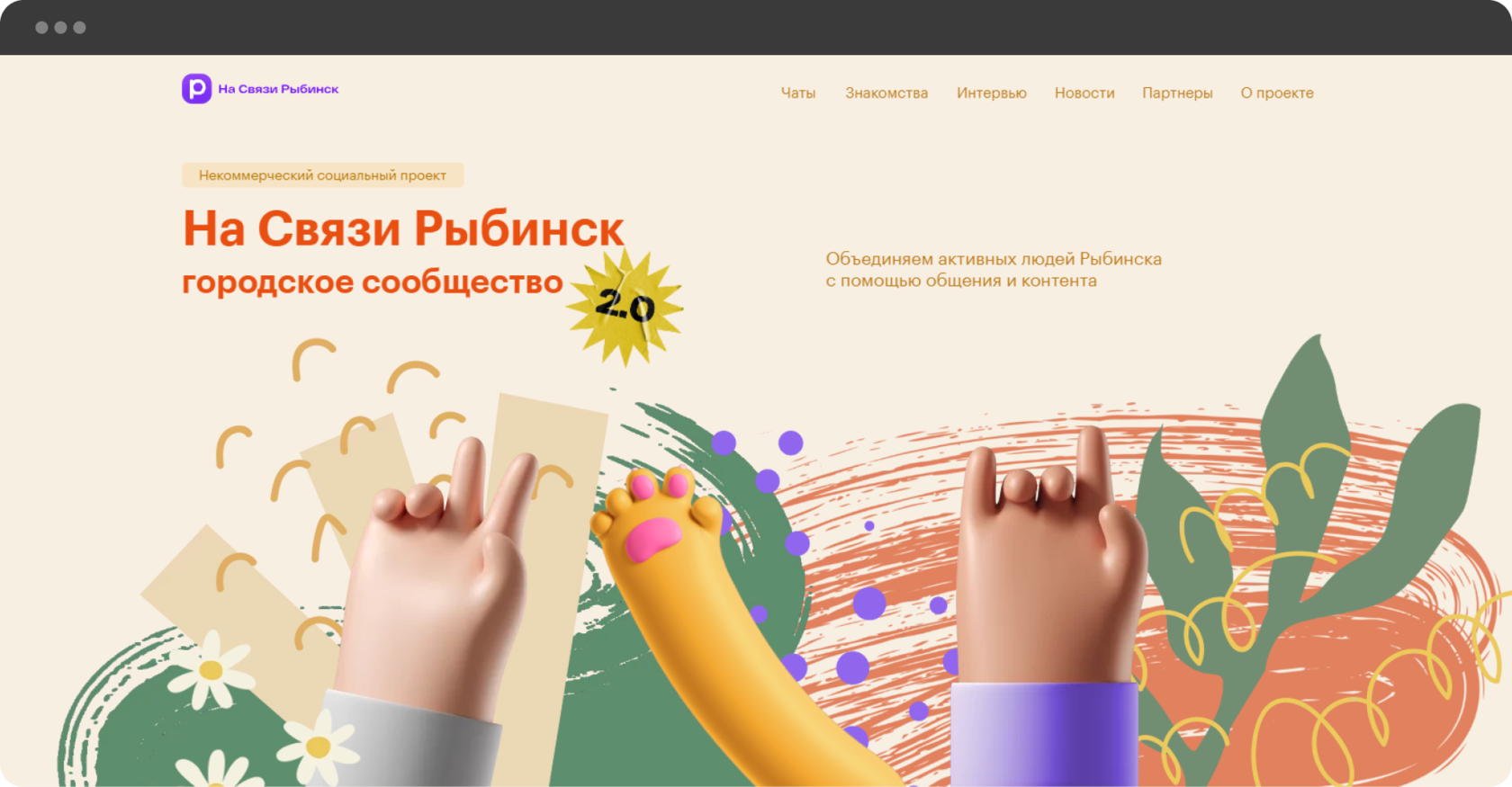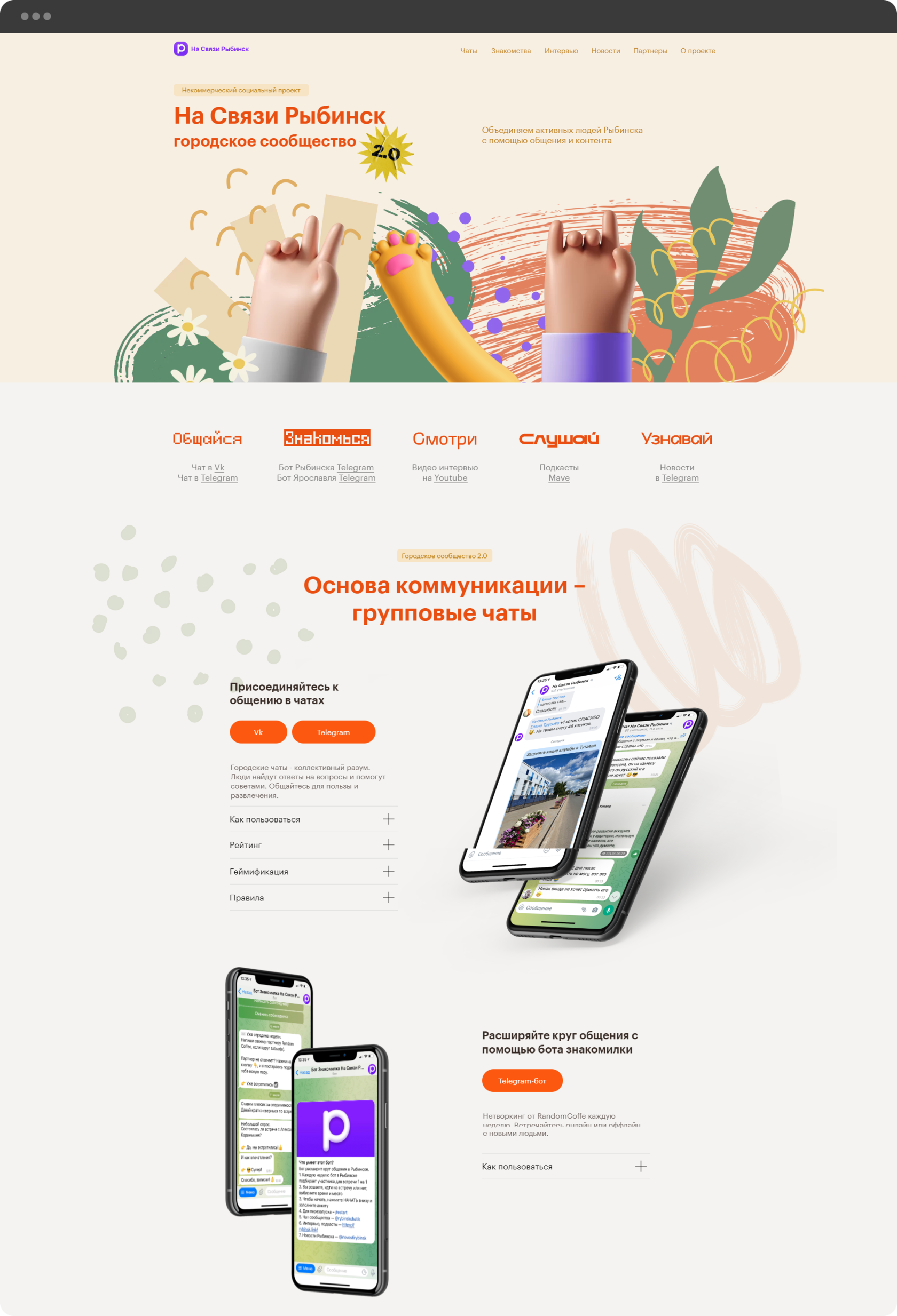 Требовалось сделать имиджевую страницу для некоммерческого проекта по нетворкингу. Нужно было передать атмосферу дружелюбности, яркости, легкости и творчества, где каждый участник позитивен и уникален.
