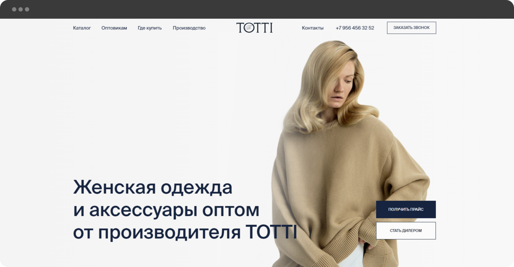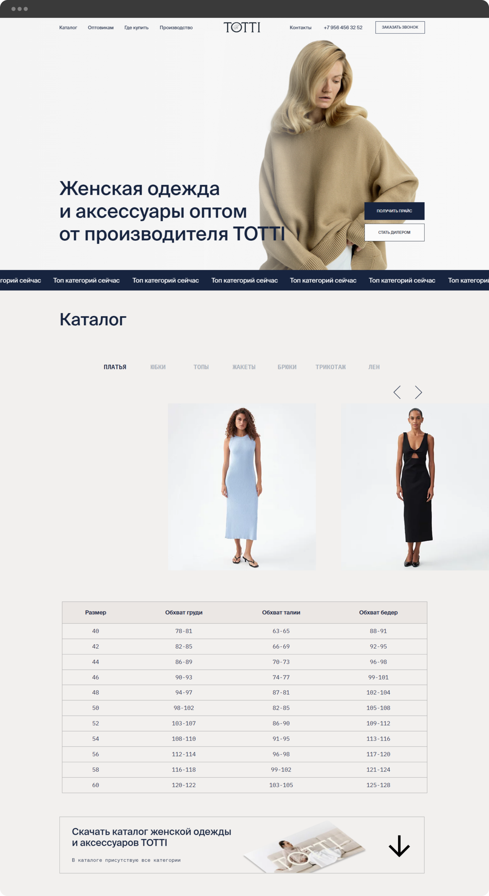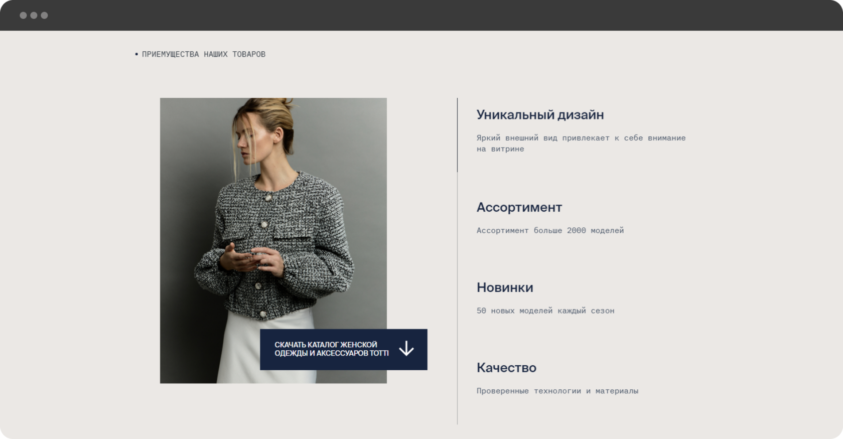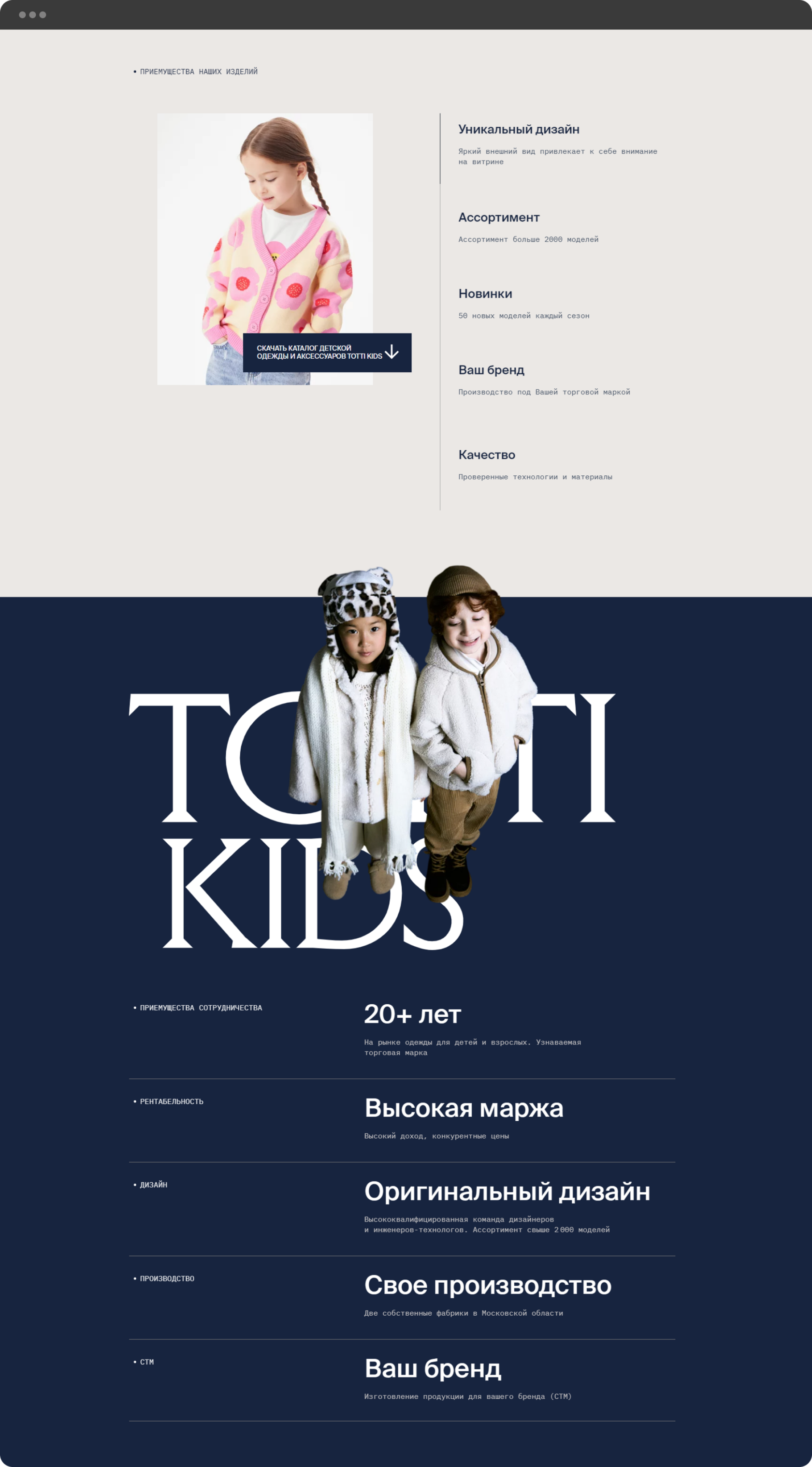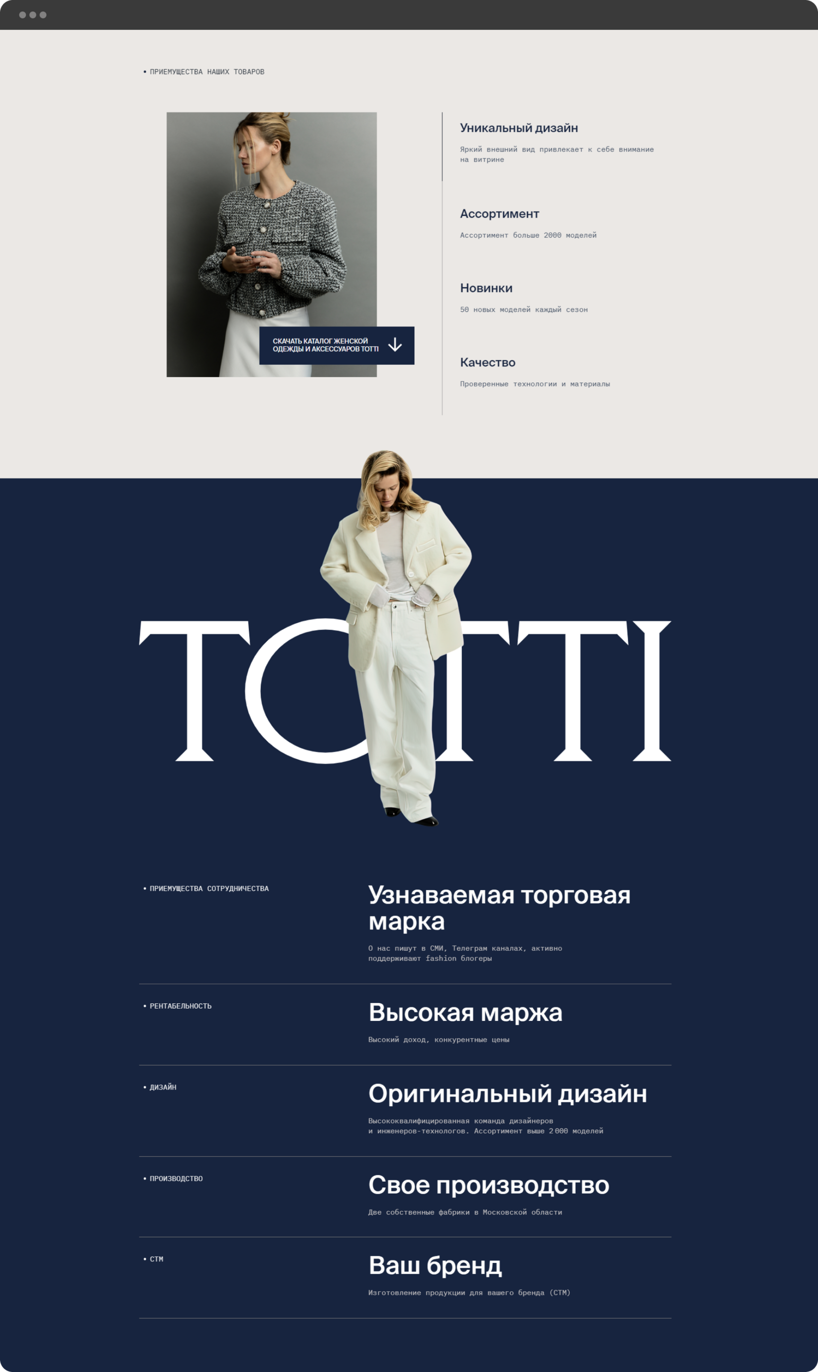 Необходимо было создать лендинг для оптовых продаж одежды российского производства. Главное, чего нужно было придерживаться в визуальном оформлении сайта - соответствие основным принципам брендинга компании.