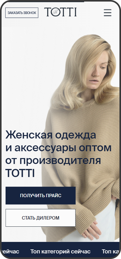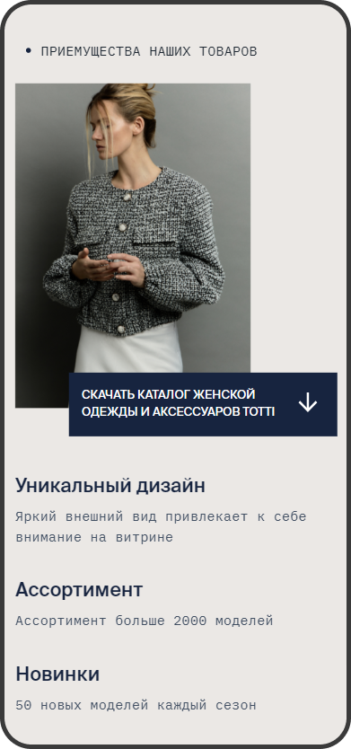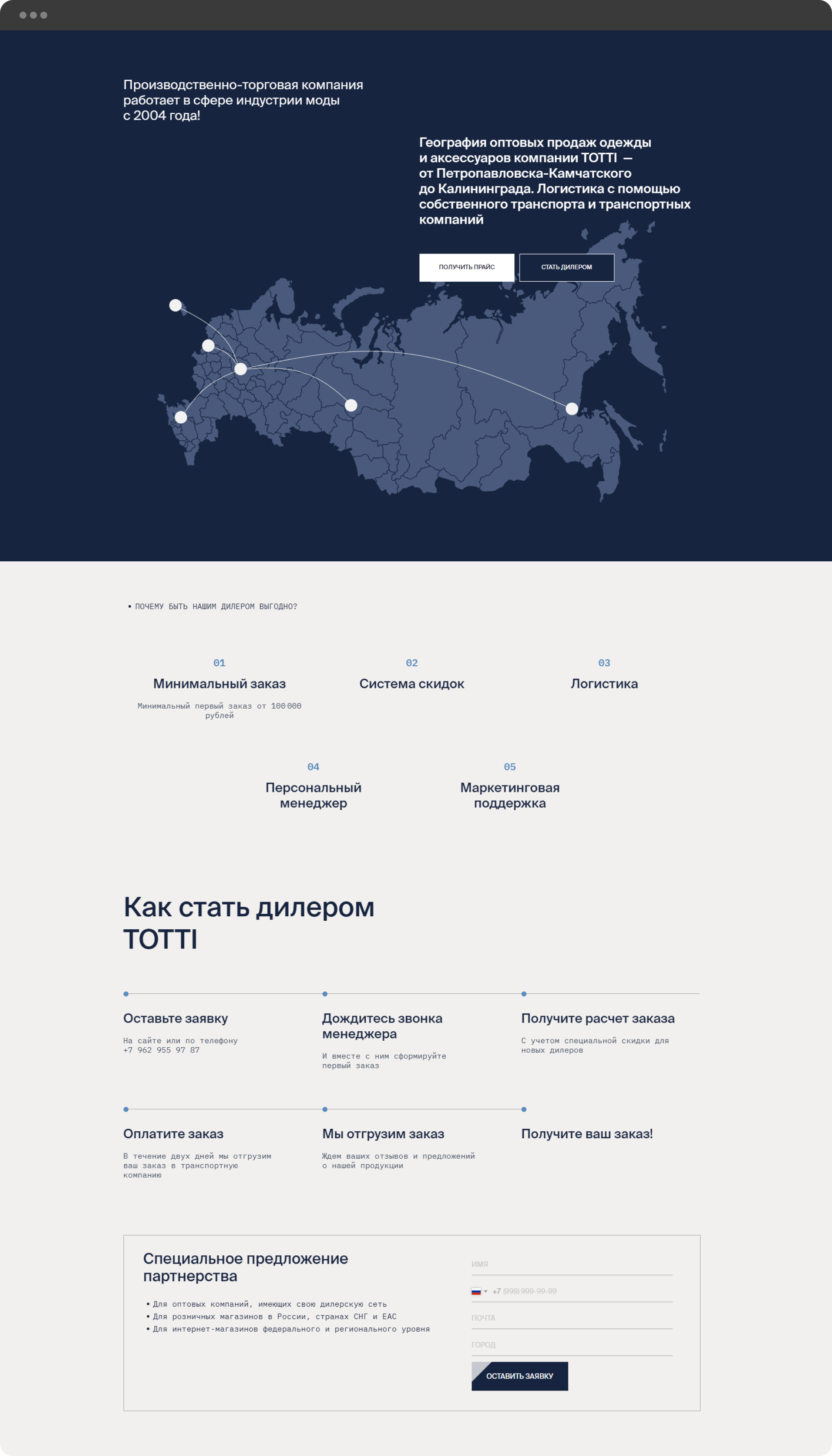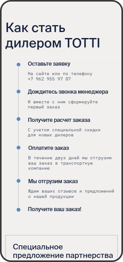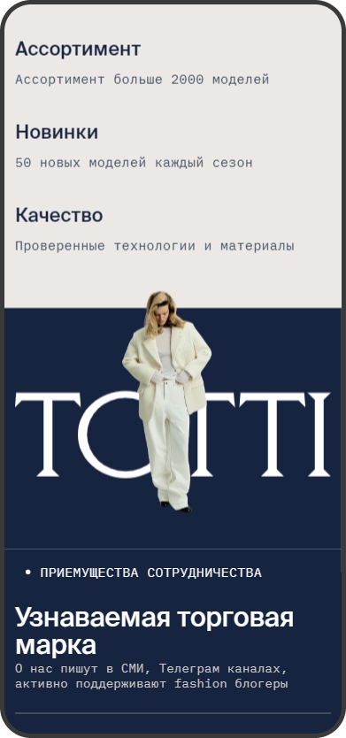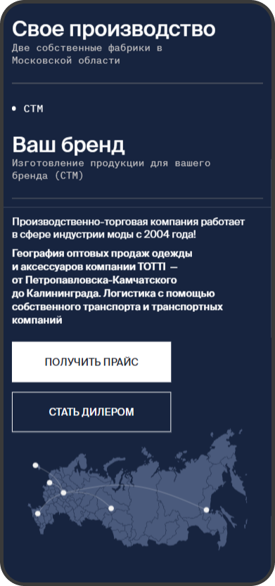 Разработанный прототип для лендинга был адаптирован для оптовых клиентов. Были добавлены блоки с информацией о минимальном заказе, преимуществами сотрудничества с производством, логистике и возможностью покупать с СТМ.