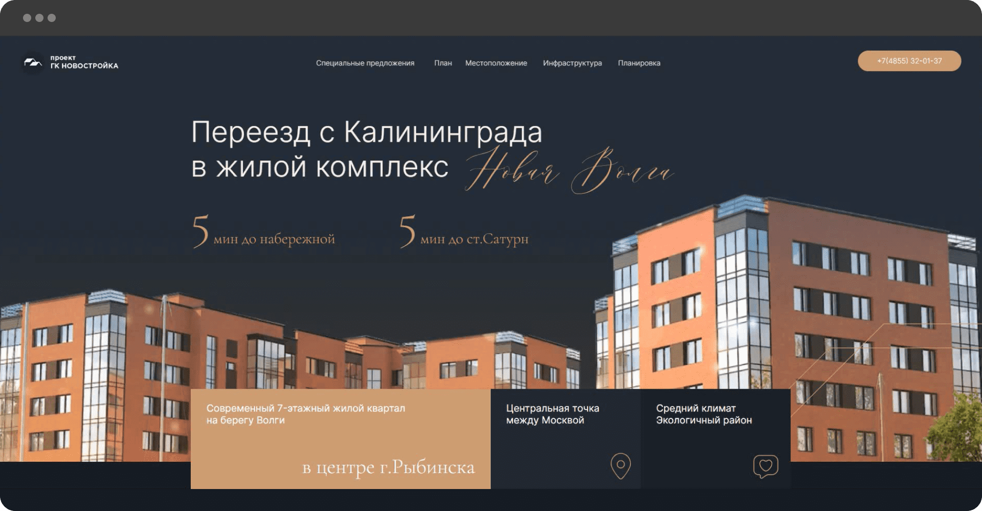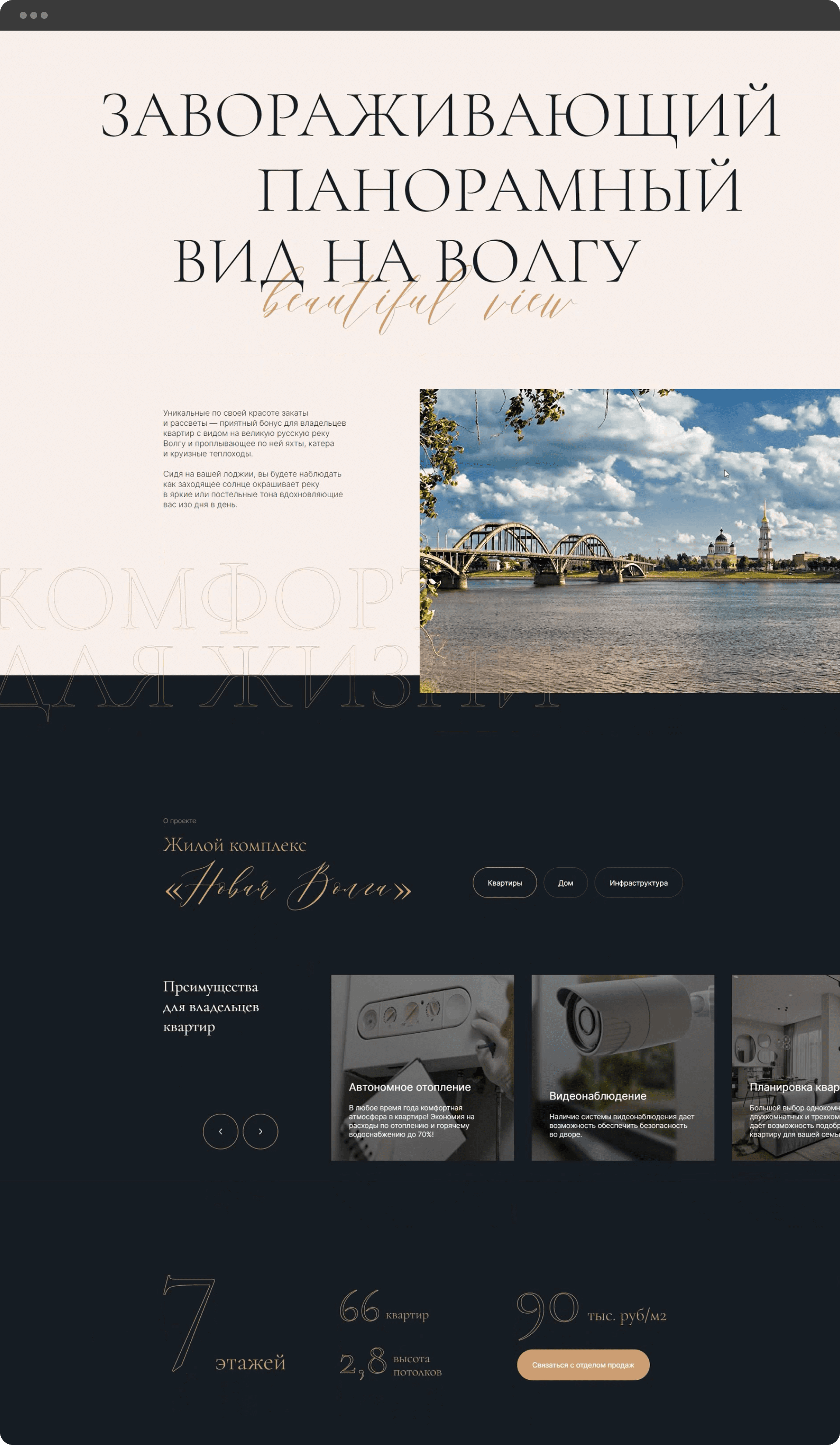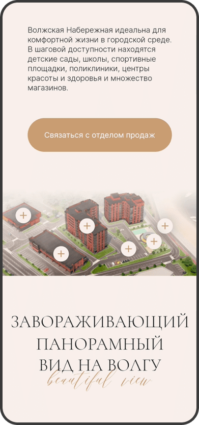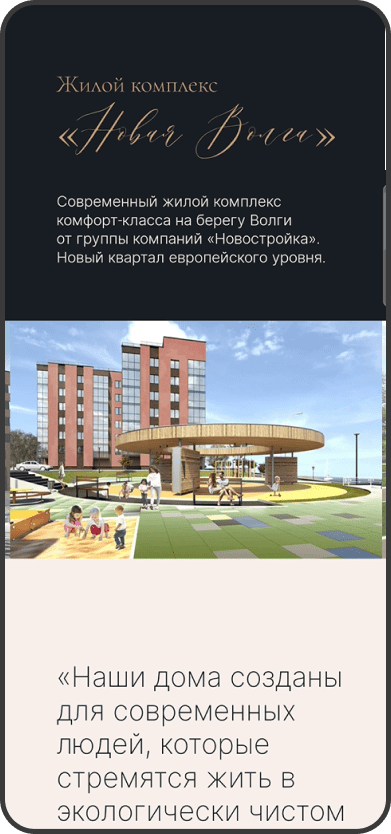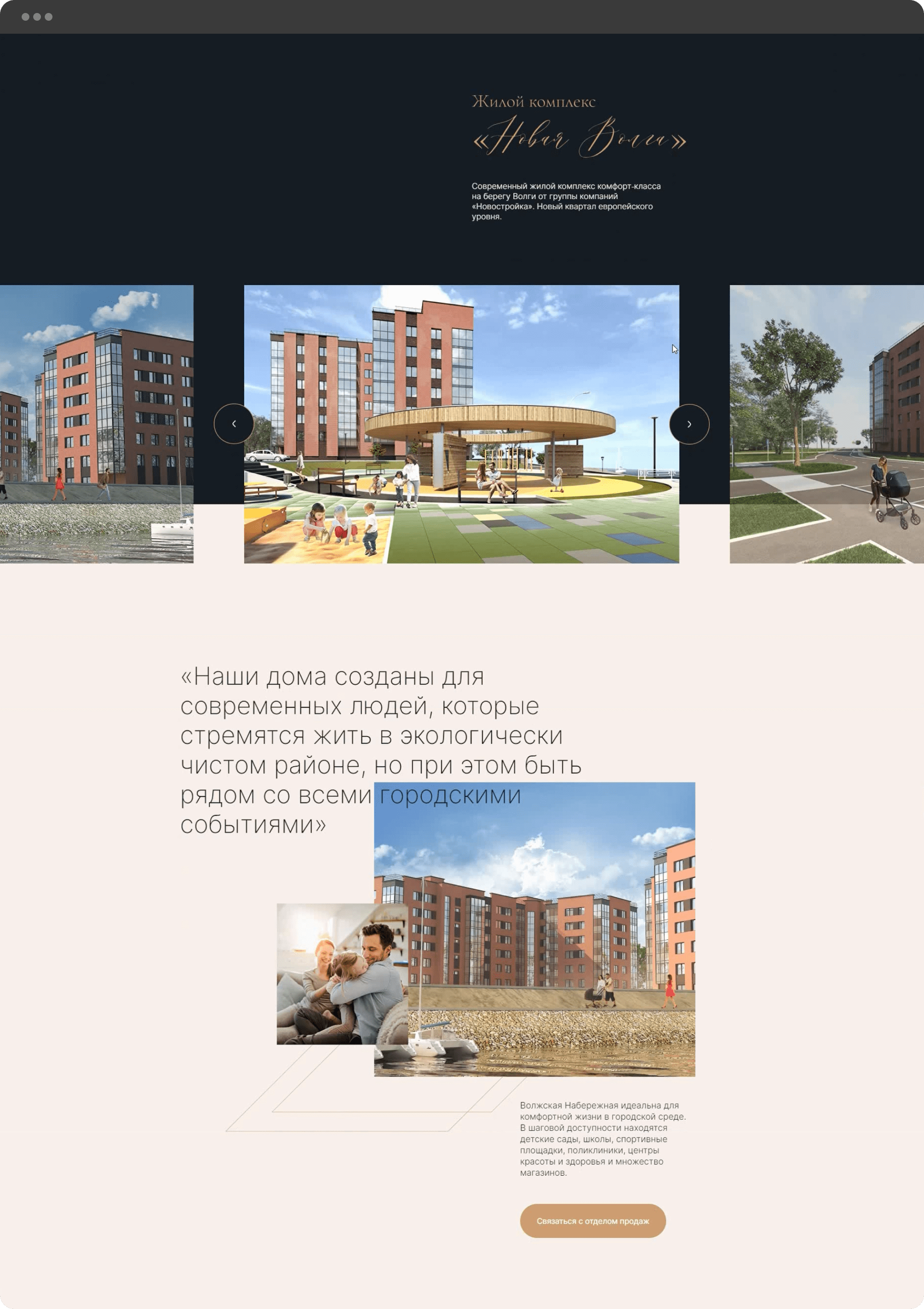 Сайт создает ощущение надежности, серьезности и премиальности компании. Требовалось сделать акцент на широкой инфраструктуре, локации нахождения ЖК и позитивных эмоциях будущих жителей.