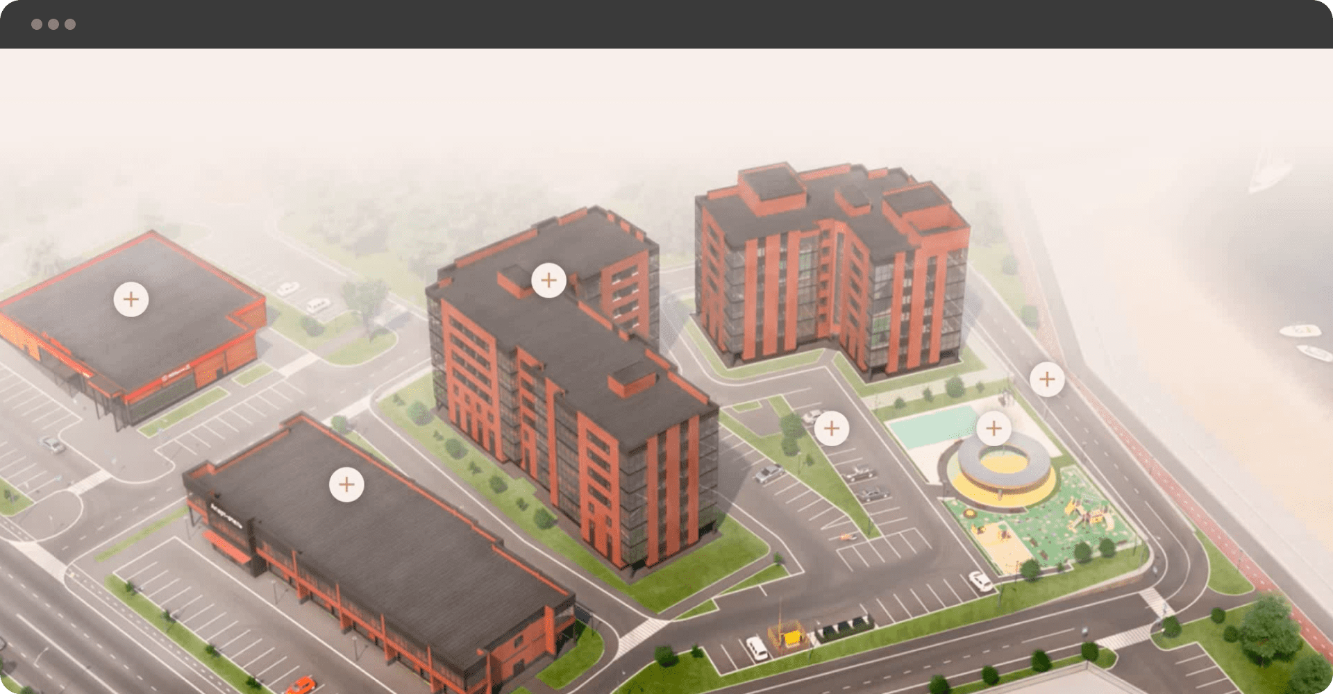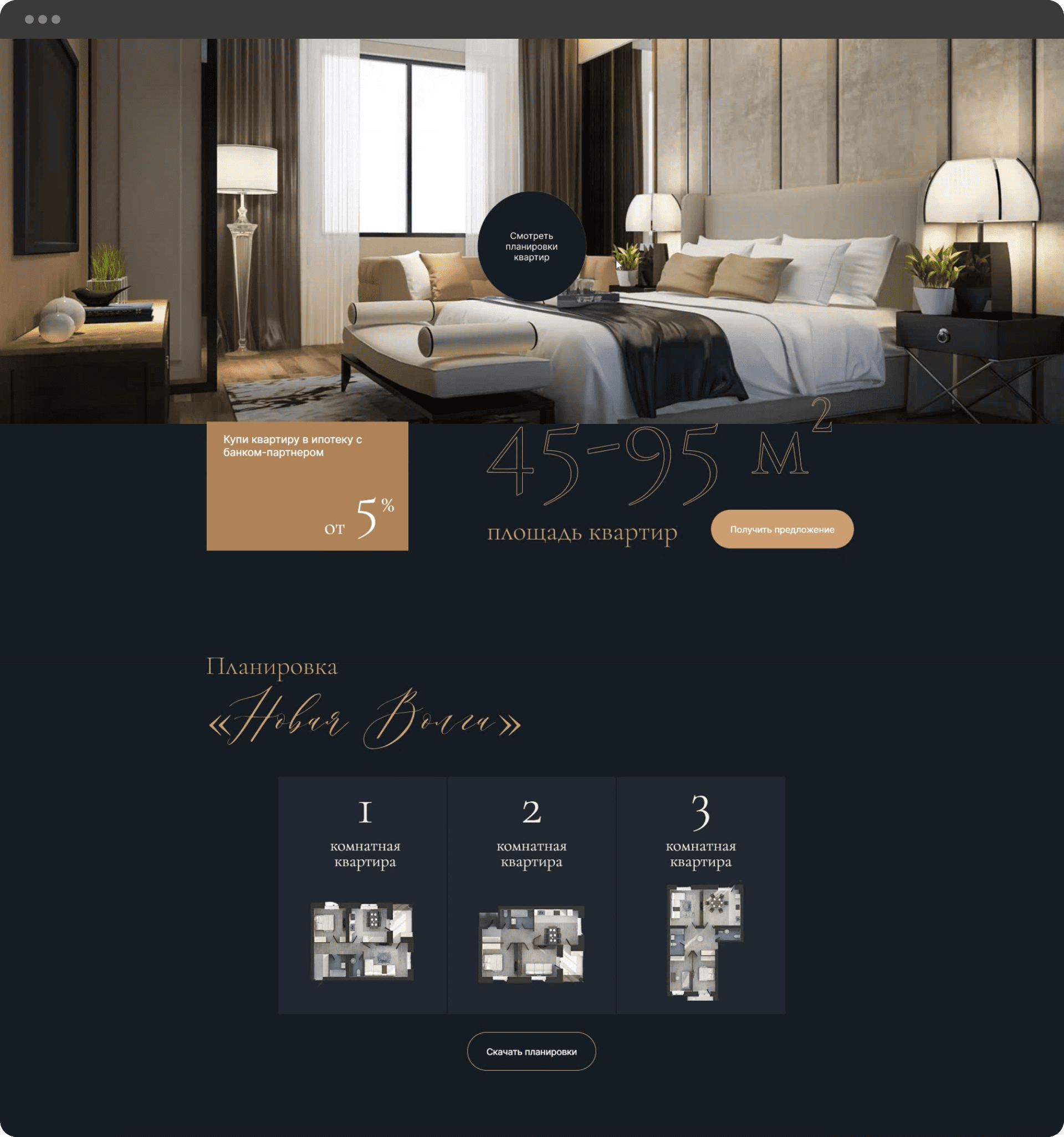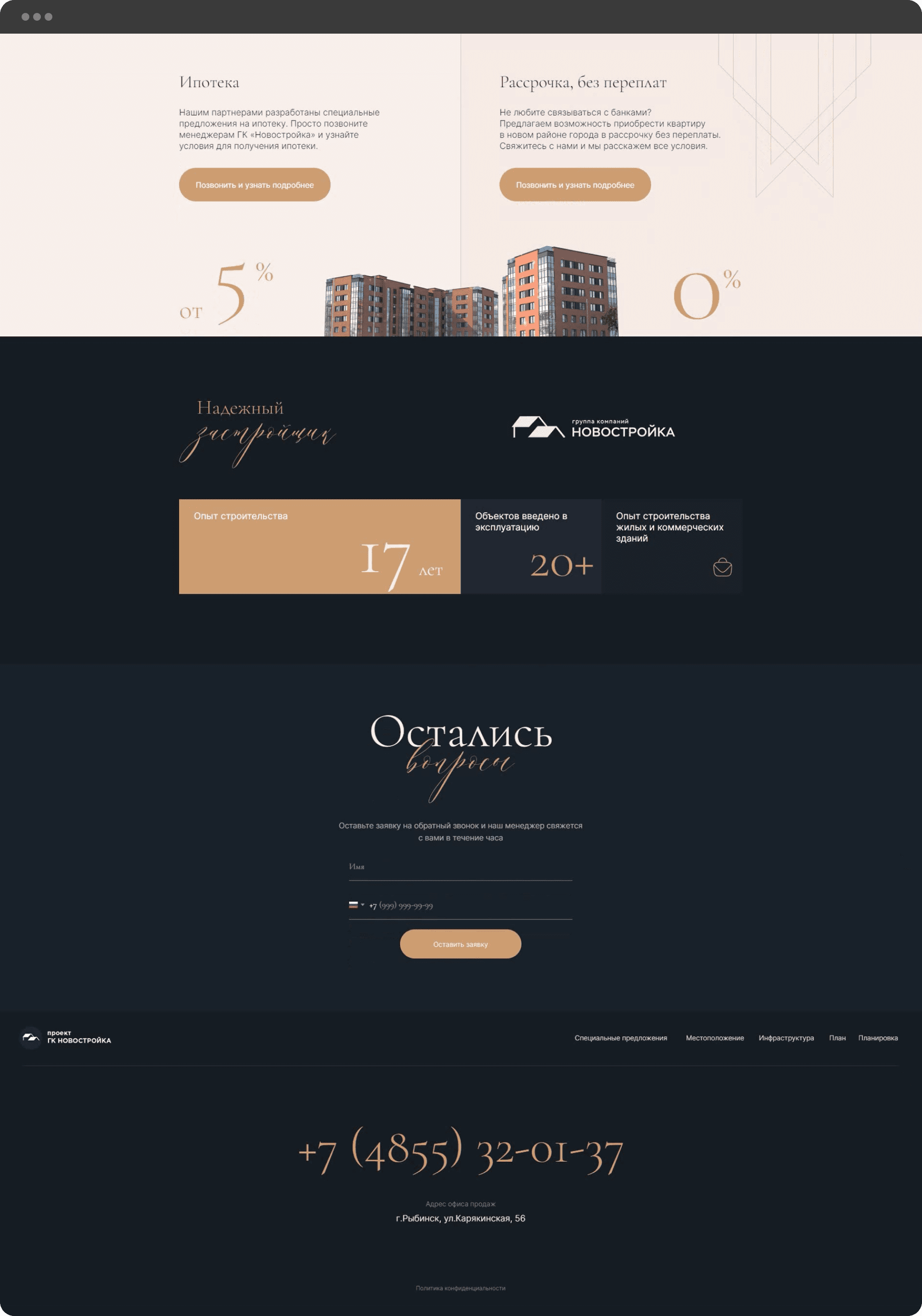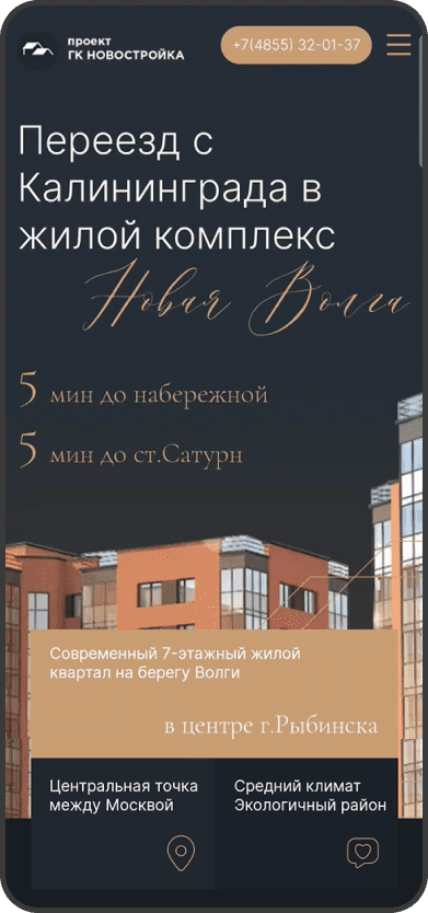 Сайт создает ощущение надежности, серьезности и премиальности компании. Требовалось сделать акцент на широкой инфраструктуре, локации нахождения ЖК и позитивных эмоциях будущих жителей.